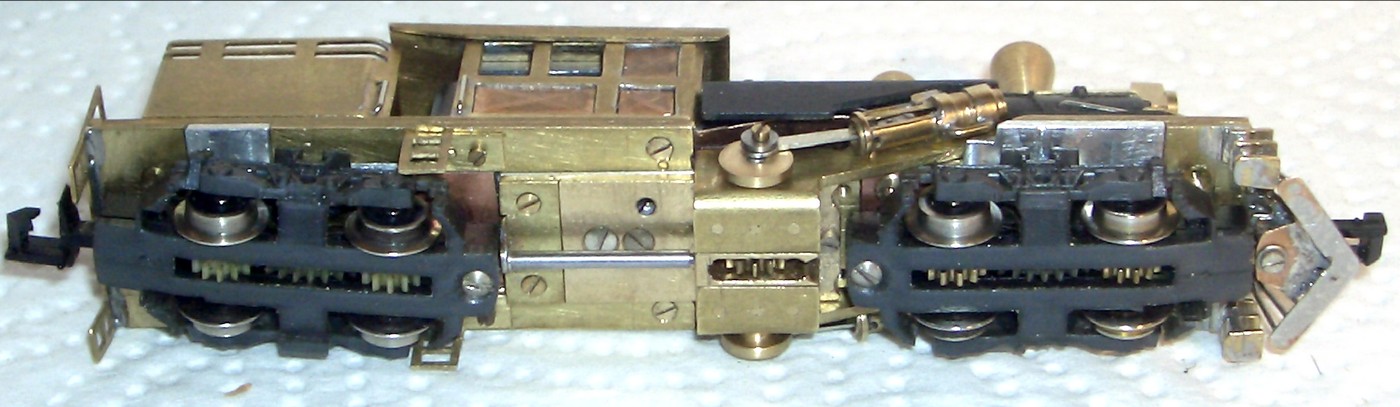 Aus Messingblech wurde einen Rahmen gefertigt, der sowohl den Motor, den Antrieb für die Dampfzylinder und den Antriebe für die Drehgestelle aufnehmen konnte. Es zeigte sich, dass die Motorachse verlängert werden musste, um auch das vordere Drehgestell anzutreiben. Dies wurde durch ein eigenes Schneckenlager für das vordere Drehgestell in Verbindung mit einer Klauenkupplung zur Motorachse ermöglicht. Zum Antrieb der Dampfzylinder wurde ein kleiner Getriebeblock entwickelt und dann im Rahmen verbaut.