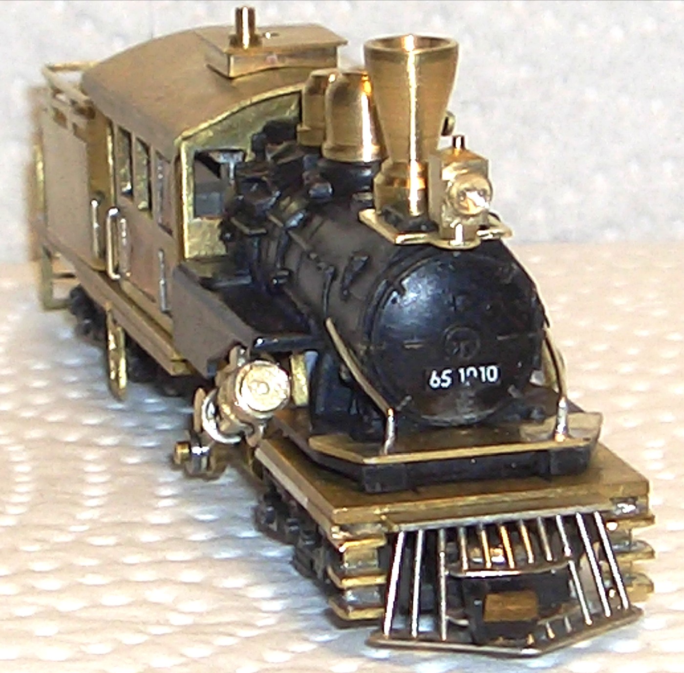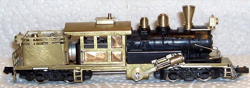Nachdem der Rahmen mit allen Antriebseinheiten komplett aufgebaut war, wurde aus Messingblech ein Führerhaus und ein Tender gefertigt. Danach wurde der Kessel gekürzt, angepasst und mit den passenden Kesselaufbauteilen versehen. Auch wurden noch Leitern, Lampen, Griffe und sonstige kleine Zurüstteile angebracht. Um das "amerikanische" Aussehen hervorzuheben durfte natürlich auch ein Kuhfänger nicht fehlen.