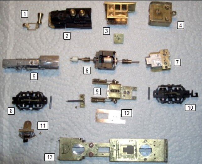 Ich wollte beim Nachbau möglichst viele vorhandene Bauteile aus der "Schrottkiste" verwenden. Es fand sich ein Kessel mit zerbrochenem Führerhaus einer BR65 von Pico, ein Motor von Fleischmann mit beidseitigen langen Motorachsen, sowie div. Schnecken- und Zahnräder. Als nächstes musste ich noch die Drehgestelle bestimmen. Die Wahl viel auf die Drehgestelle einer BR211 von Arnold. Die wurden dann noch kostengünstig bei Ebay ersteigert. Mit diesen vorhandenen Teilen begann ich dann meine Planung.