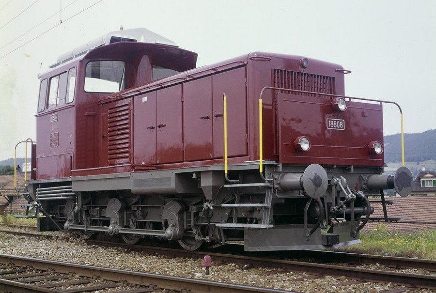 ![]() Em 3/3 18808, Typenbild Quelle: Archiv SBB In den 1950er Jahren unternahmen die SBB einige Anstrengungen, um die veralteten Dampfloks aus dem Betrieb nehmen zu können. Hauptziel war die vollständige Elektrifizierung des SBB-Streckennetzes. Dennoch blieben einige Anschlussgleise ohne Fahrleitung. Hier hielten sich die letzten E 3/3 noch längere Zeit im Rangierdienst. Abhilfe schafften hier schliesslich die diesel-elektrischen Rangierlokomotiven Em 3/3, die zwischen 1959 bis 1963 beschafft wurden. Die Em 3/3 sind leistungsmässig mit den elektrischen Ee 3/3 vergleichbar. 1959 erfolgte die Auslieferung der sechs Prototypen 18801 - 18806), die sich durch ihren V-Dieselmotor mit acht Zylindern von den späteren Serienloks unterscheiden. Die Serienlokomotiven, die 1962 und 1963 geliefert wurden, besassen einen leichteren sechszylindrigen Motor. Die Em 3/3 kamen über viele Jahre in der ganzen Schweiz zum Einsatz. 1995 wurde die Em 18803 wegen Motorschadens ausrangiert und letztlich abgebrochen. Die weiteren Maschinen wurden im Zuge der Divisionierung der SBB den drei Divisionen Güterverkehr, Personenverkehr und Infrastruktur zugeteilt, wobei der grösste Teil zur SBB Cargo kam. In den folgenden Jahren wurden die Em 3/3 nach und nach ausrangiert und durch die modernen Am 843 ersetzt. | ||
