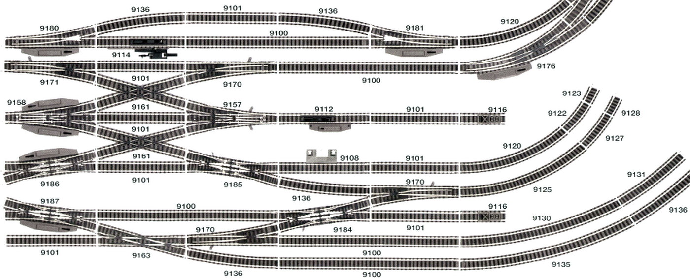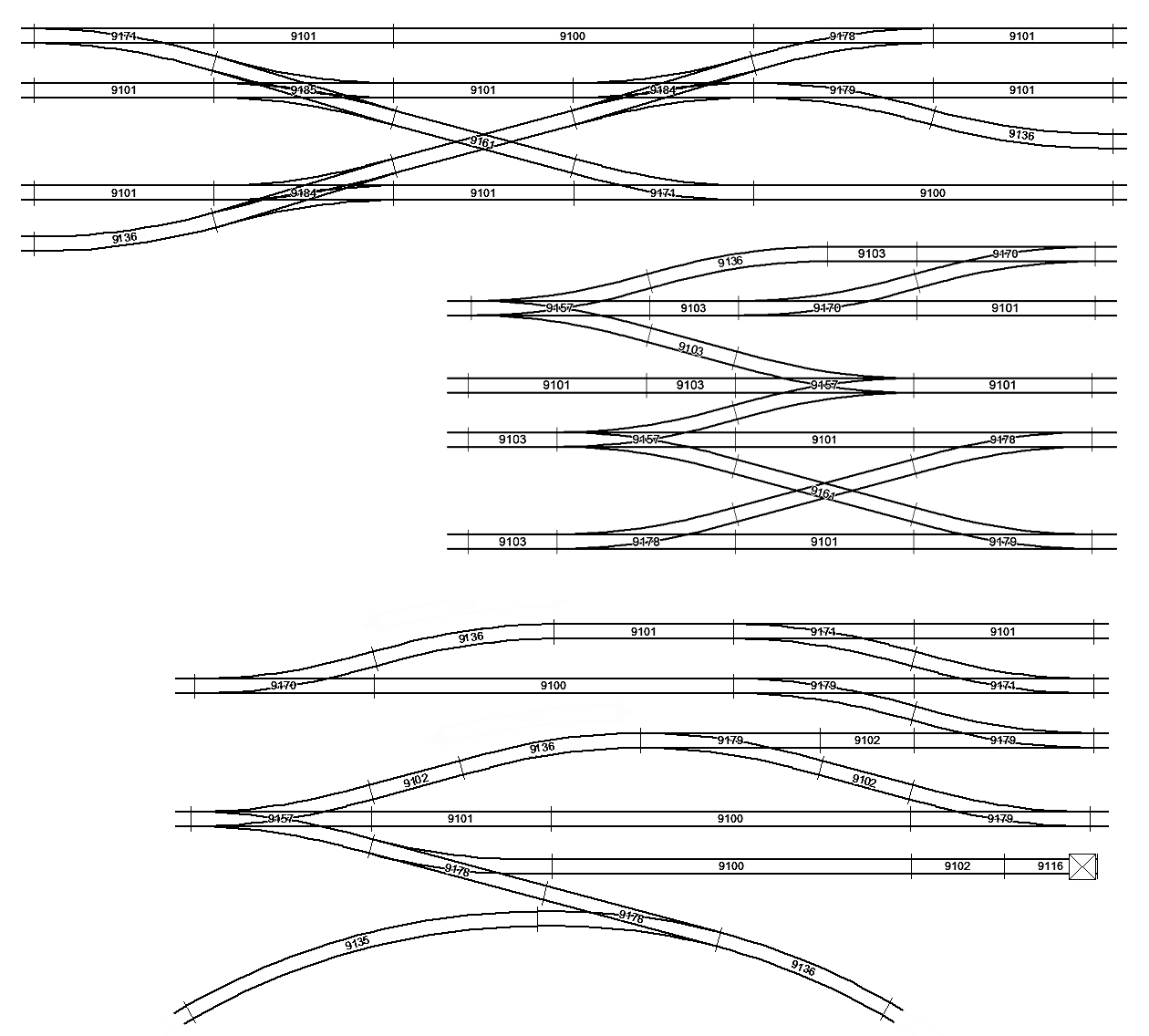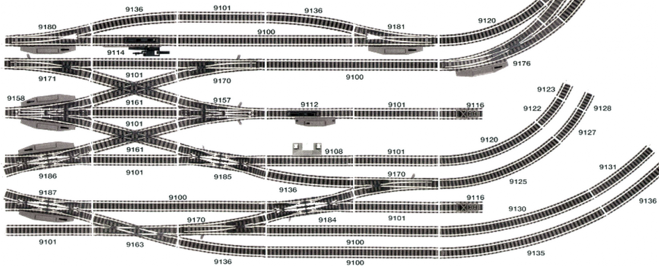 Die Gleisgeometrie erscheint durch das umfangreiche Gleissortiment mit mehreren Radien und Ausgleichsgleisstücken recht komplex.
