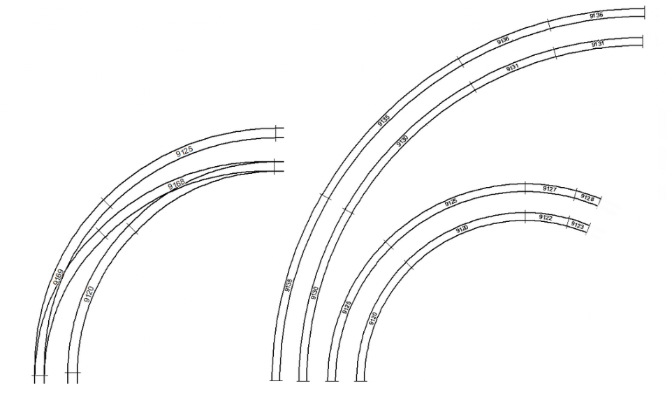 R2 = 225,6 mm, 45°, 15° und 7,5° Gleise