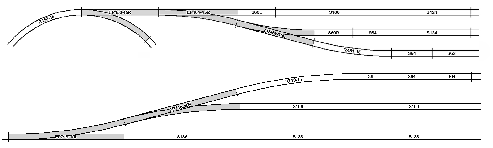 Gerade Weichen 15° mit Abzweigradius R 481 und R 718
