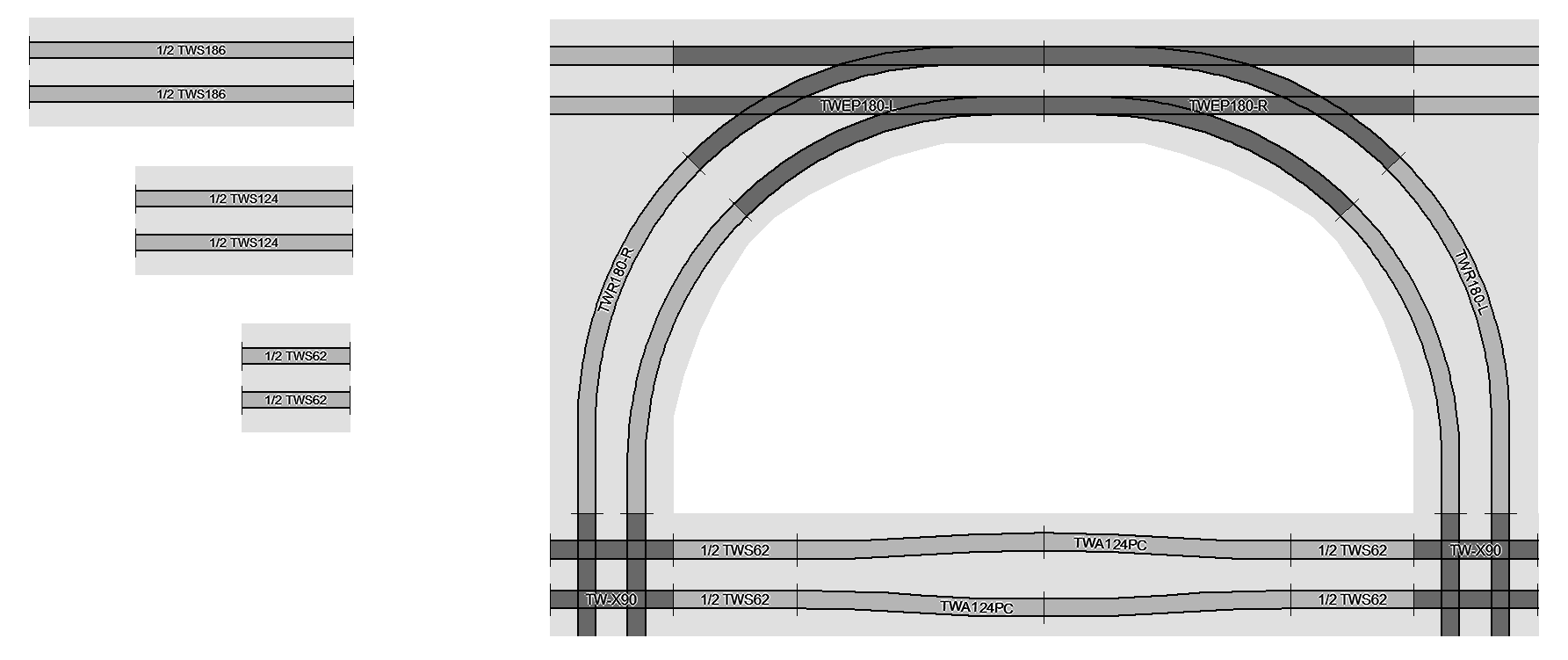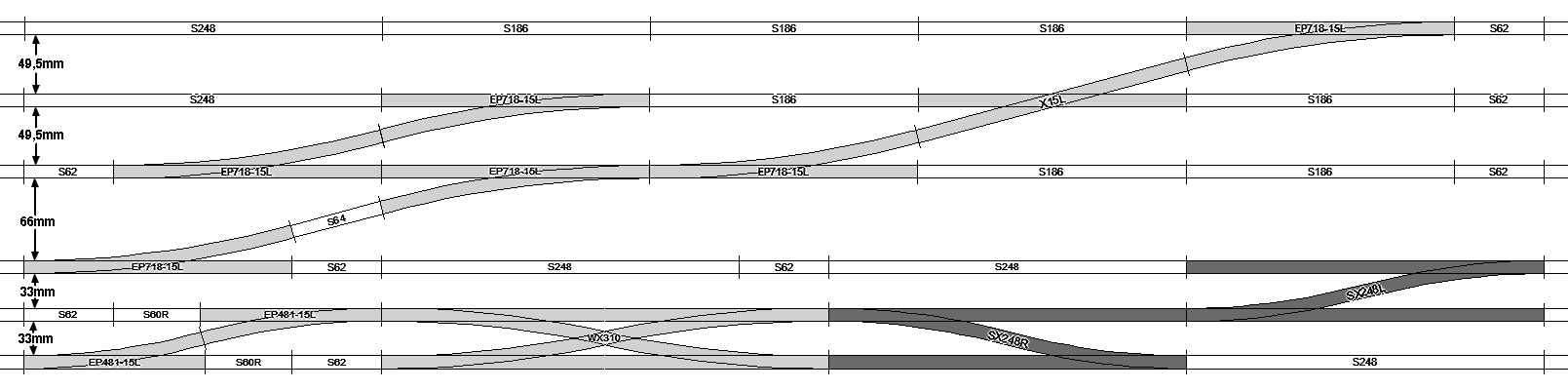 Die Geometrie beinhaltet 7 Radien ohne Bogenweichen. Der Parallelabstand der Gleise beträgt 33 mm.