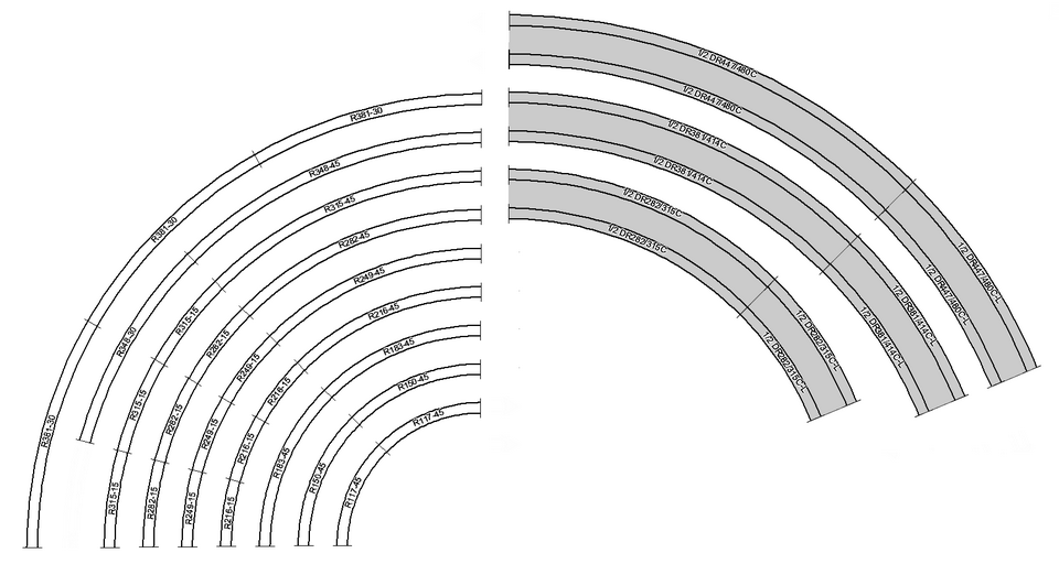 R 315 mm, 45° und 15° Gleise