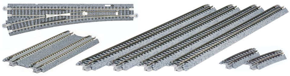 Das Gleissystem des japanischen Herstellers Kato besteht aus Neusilberschienen mit nachgebildeten Holzschwellen oder Betonschwellen und grauem Schotterbett.