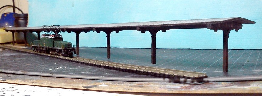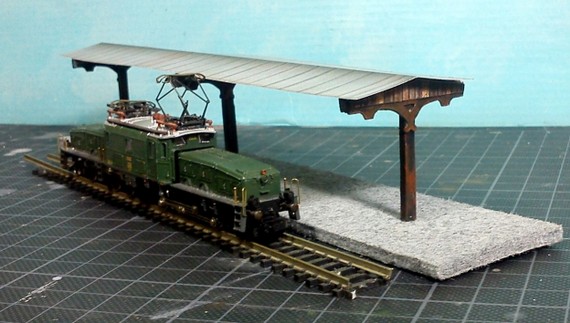 ![]() Als nächstes habe ich das gedruckte Dach auf einen Karton aufgezogen und gleichsam die Unterseite eingekleidet. Anschliessend die Stützen angeklebt und die Dachbalken eingepasst. ![]() Das fertig gebaute Dach hat eine Länge von rund 60 cm. Es ist noch nicht fix montiert, zuvor muss das Perron noch mit Details wie Treppenaufgang, Schildern, Bänken usw. ausgestattet werden. ![]() ![]() | ||