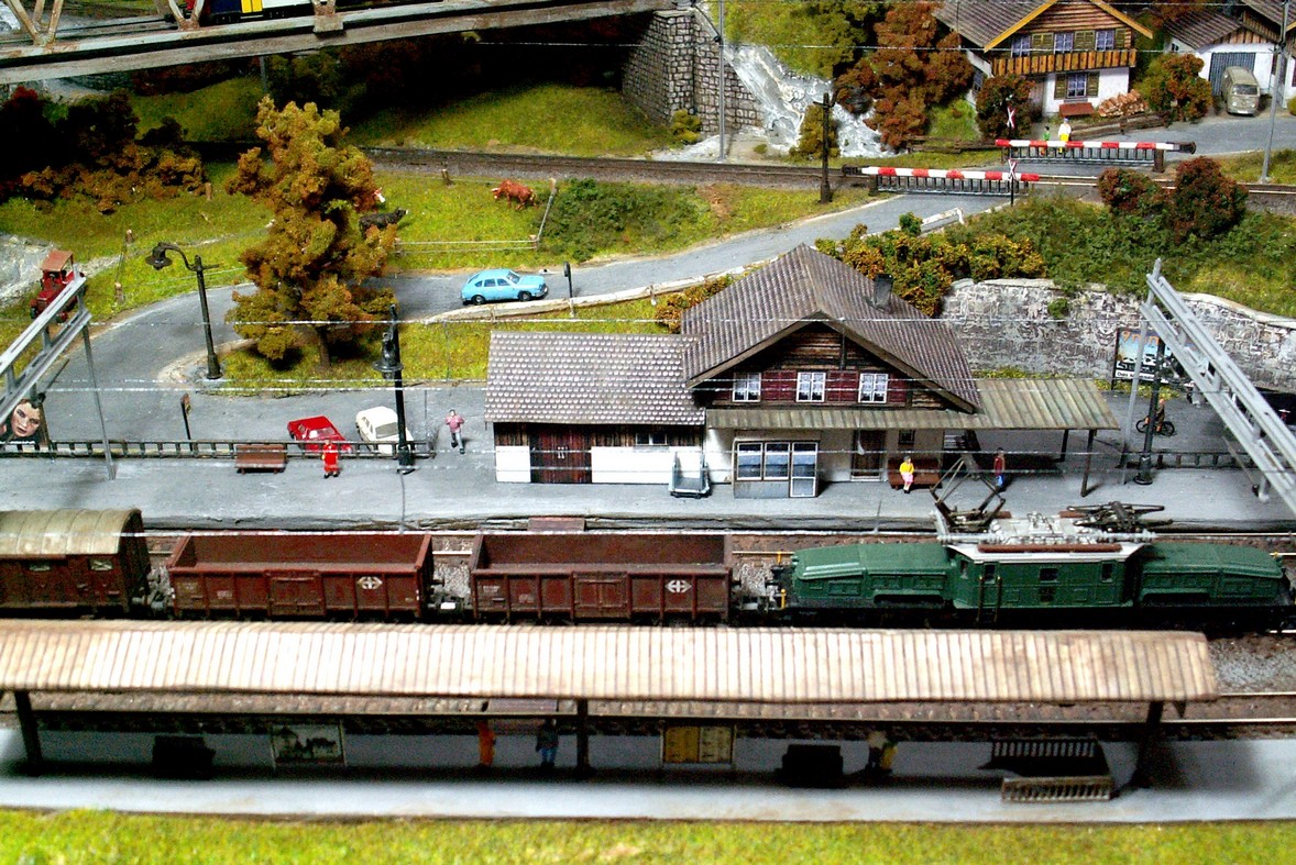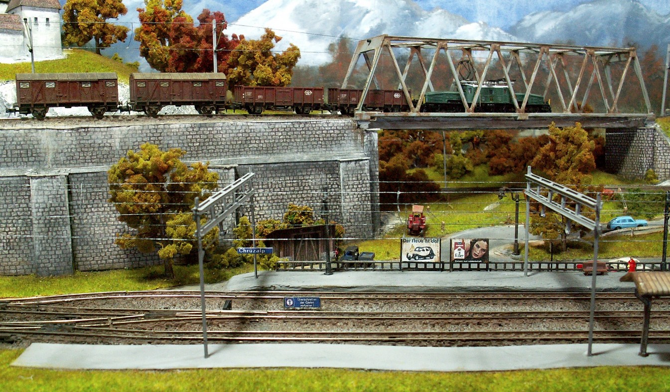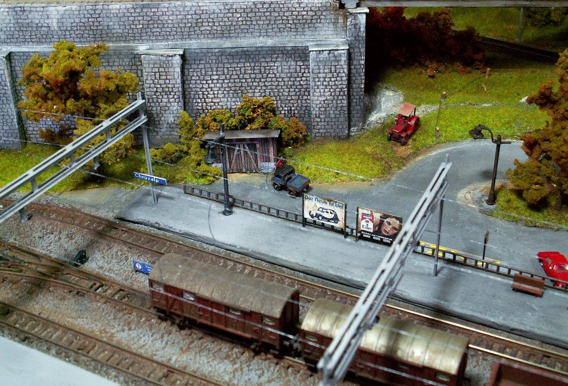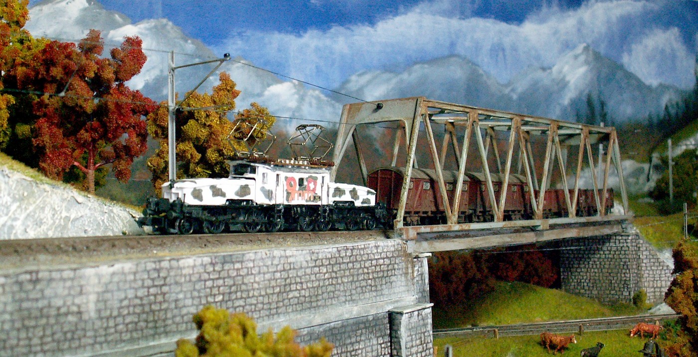 Einige Impressionen von der "Chrüzalp". Eine Berglandschaft auf rund 150 x 70 cm. Auch für diese Anlage habe ich - nebst den Gebäuden versteht sich - die gesamte Fahrleitung im Eigenbau angefertigt.